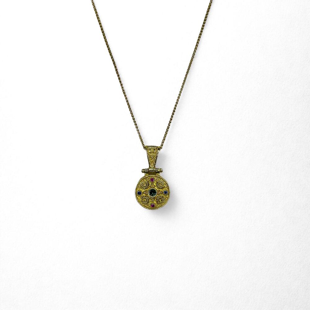 Η ανάγλυφη υφή του μετάλλου και η συμμετρική τοποθέτηση των χρωματιστών λίθων συνθέτουν ένα κόσμημα-κειμήλιο, που αποπνέει μια αίσθηση μυστηρίου και εκλεπτυσμένης πολυτέλειας, ιδανικό για να αποτελέσει το κεντρικό σημείο κάθε αισθητικής αναζήτησης.